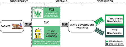 Notes: Minimum Support Price (MSP) is the price at which food grain is procured; CIP is the Central Issue Price; FCI refers to the Food Corporation of India; OWS means Other Welfare Schemes.