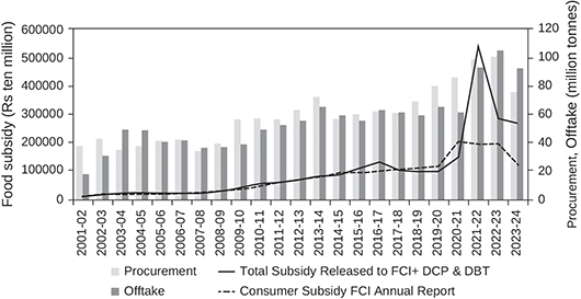 Source: Procurement and offtake are from the Database on the Indian Economy, Reserve Bank of India; subsidy released is from the FCI Annual Reports (various years) and Food Grain Bulletin Archive (various years in current prices). The details of what is included or excluded are available with the authors.
