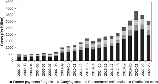 Figure 3 illustrates the share of the different components in the total costs. It is not hard to see that a bulk of the BFS constitutes compensation to farmers, so that embedded in the official figures of Consumer Food Subsidy is a large component that constitutes costs, but of the type that are directed to a specific group of stakeholders, the farmers. Between 2001–02 and 2022–23, as much as 62 per cent of the costs, on average, were compensation to farmers for grain supplied, 25 per cent represented procurement incidentals and distribution costs, and 13 per cent were carrying costs associated with stockholding.