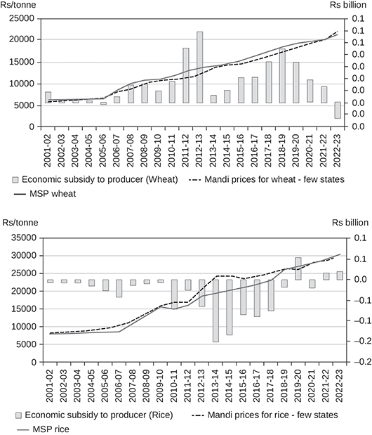 Figure 5 Producers’ economic subsidy, wholesale prices, and minimum support prices at current prices – for wheat (top) and rice (bottom), 2001–02 to 2022–23, India in nominal rupees and rupees billion