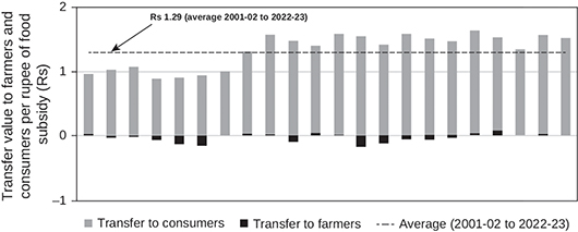 This approach shows that each rupee of the food subsidy reported in government accounts represents a transfer worth Rs 1.29 to consumers and farmers, on average, for the period 2001–02 to 2022–23; i.e. each rupee transferred to these groups is associated with a cost of Rs 0.79 to the government.
