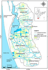 Figure 1 Map of Kuttanad region with the major landmarks and cropping systems