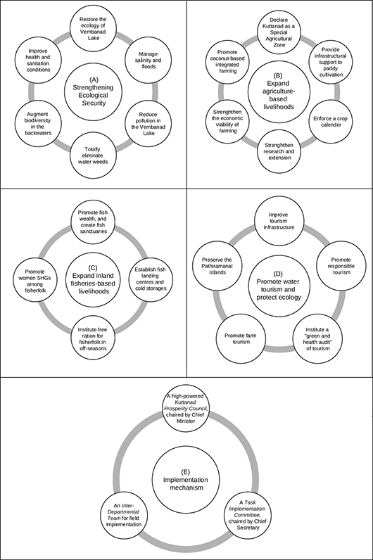 The MSSRF report of 2007 contained a detailed analysis of the historical and contemporary problems that plagued the Kuttanad wetland ecosystem. It structured its recommendations under five heads. These were (a) strengthening ecological security; (b) agriculture-based livelihoods; (c) inland fisheries-based livelihoods; (d) water tourism; and (e) the implementation mechanism. I do not wish to detail each recommendation – see Figure 3 for a list – but shall limit myself to a brief introduction to the broad approach of the report.