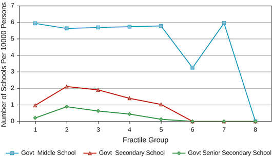 First, in the case of government secondary and senior secondary schools, the availability of schools was the highest in fractile 2, and was lower in all other fractiles. The availability was almost nil for villages in fractile 6 and above. To put it differently, there was no government Secondary or Senior Secondary school in villages where people of the Scheduled Castes comprised more than one-half of the village population. The number of middle schools per 10,000 persons was almost same in villages in different fractile groups with a few exceptions.