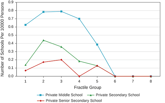With respect to educational institutions, the Census covers all schools, and colleges, including professional colleges. The Census provides data separately for government and private institutions. We focus on middle schools, secondary schools and senior secondary schools, defined as follows: