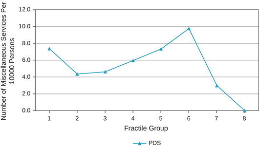 Lastly, we examined the presence of ration shops under the Public Distribution System (PDS), regular markets, anganwadis (child care centres), and public libraries (Graphs 7 and Appendix Table 7). There was an anganwadi in every village, the one success story in terms of social infrastructure. PDS shops were in a large majority of villages in all fractile groups except the last. This is worrisome given the likelihood of high dependence on PDS in villages in fractile group 8.
