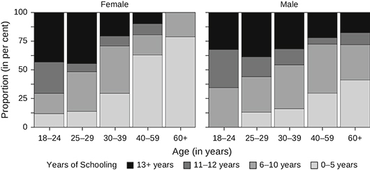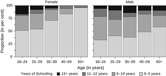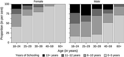 A clear generational shift in educational attainment was observed in Mahatwar, particularly among women (Figures 1 and 2).9 The older female cohorts had the least years of schooling, while there was an expansion of higher education among the youngest age cohorts. More than 50 per cent of women in the age group 20–29 had completed at least secondary education, which is higher than men in the same age group. Among men, even in the older generation, there were persons with more than 13 years of schooling. Thus, the gender gap has narrowed among the younger cohorts.