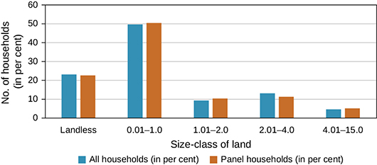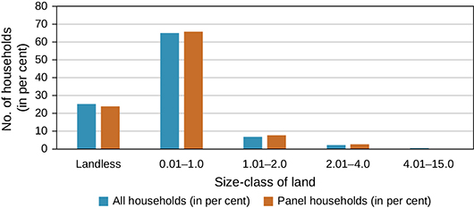 There were small discrepancies between the panel and longitudinal data in respect of caste composition. The panel had a lower representation of Muslim households than in the 2006 survey (Table 3). Appendix Figures 3 and 4 show the distribution of households by extent of crop land owned, and there is a slight underrepresentation of landless households and overrepresentation of medium and large landowning households in the panel relative to the two cross-section surveys.