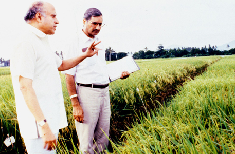 At IRRI, Swaminathan would visit experimental rice plots early in the morning before any of us scientists came to the office. He used to have discussions with scientists in the field, and I often invited him to look at my breeding material. Six varieties, namely, IR60, IR62, IR64, IR65, IR66, and IR68, were released by IRRI during his tenure as the Director General. IR64 became the most widely grown variety of rice in the world. It has been grown on more than 10 million hectares of rice land in the world annually.
