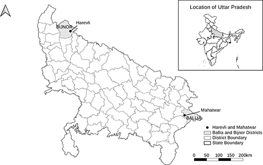 Figure 1 Map showing the districts and study villages, Harevli, Bijnor, and Mahatwar, Ballia, Uttar Pradesh, 2023