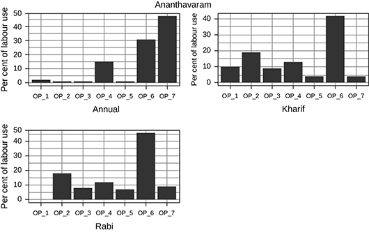 Figure A1 Labour time absorbed in each crop operation as a proportion of labour time absorbed in all crop operations in a season, Ananthavaram in per cent