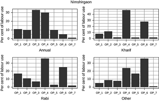 Figure A2 Labour time absorbed in each crop operation as a proportion of labour time absorbed in all crop operations in a season, Nimshirgaon in per cent