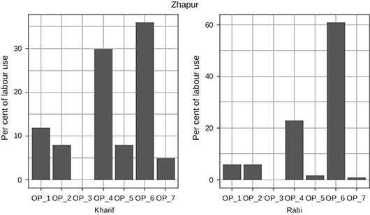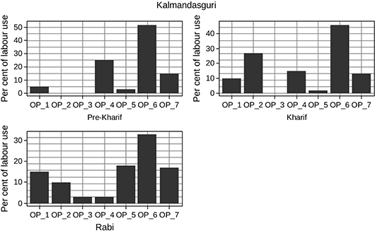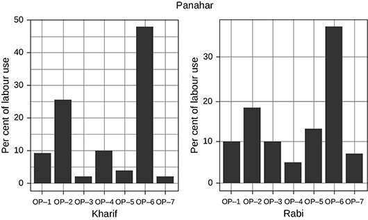 In the study villages, intra-seasonal variation in labour deployment was remarkably high. Intra-seasonal variation primarily occurs due to differential labour requirements to perform agricultural operations.9 Some agricultural tasks also overlapped within the same time period. For instance, irrigation, weeding, and applying fertilizer and pesticides were undertaken either simultaneously or in quick succession of each other during the intermediate period of crop duration. Among the major agricultural tasks, harvest and post-harvest operations demanded a large share of labour for most crops and in most seasons across the study villages.
