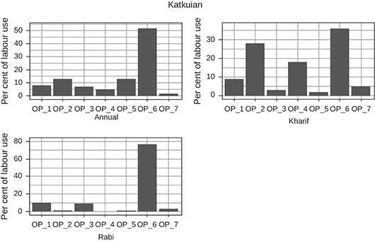 Figure A7 Labour time absorbed in each crop operation as a proportion of labour time absorbed in all crop operations in a season, Katkuian in per cent