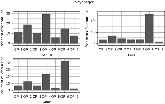 Figure A8 Labour time absorbed in each crop operation as a proportion of labour time absorbed in all crop operations in a season, Nayanagar in per cent