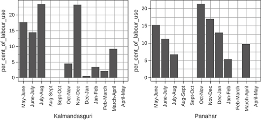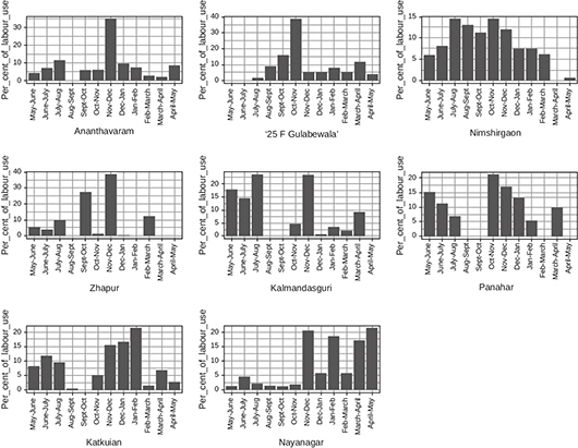 Month-wise distribution of labour use in crop production in a production year provides a clear picture of peaks and troughs in labour deployment. For instance, in Kalmandasguri and Panahar in West Bengal (Figure 2), the major crops grown were jute (Kalmandasguri) and rice (Panahar) in the pre-kharif (summer) season; rice in kharif; and potato, rice, and sesame in rabi.10 In Kalmandasguri, about 89 per cent of the total labour use was concentrated in four months of the year. The two peak labour-absorbing periods were July–August (absorbing 24 per cent of total labour use for jute harvesting and post-harvesting operations) and November–December (absorbing 23.5 per cent of total labour use for rice harvesting). No labour was absorbed in crop production in September–October, January–February, and April–May; a similar pattern was observed in Panahar. So, even with a three-season crop cycle in these West Bengal villages, variability in labour use over months in the production year was observed.