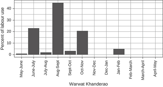 In Warwat Khanderao in Maharashtra, a dry village growing cotton in the kharif season and with almost no crop cultivated in the rabi season, the month-wise variability in labour use was even sharper. Figure 3 suggests that no labour was absorbed in five months of the production year, and that another four months absorbed only 11 per cent of total labour use. The major share of labour was absorbed in August–September (45 per cent for weeding in cotton, and harvesting and post-harvesting operations in green gram and pigeon pea intercropped with cotton). In June–July and October–November, the major labour-absorbing agricultural tasks were sowing and picking cotton, respectively, and these two operations absorbed 66 per cent of total labour use. Even if cultivators preferred to retain peak-period labour throughout the year to avoid any shortage of labour during the peak period, 55 per cent of unutilised labour time could be shifted from crop production for at least five months (November–January and again from February to April/May), as no labour time was absorbed during this period. This indicates the inability of crop production to consistently generate employment throughout the production year.